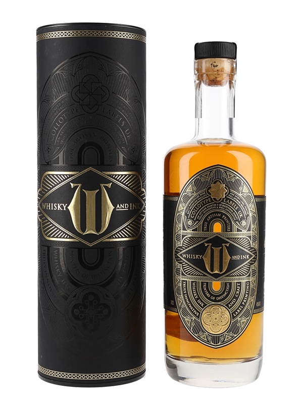A limited edition bottle of Whisky and Ink Blended Scotch Whisky, a blend of malt whisky from Dailuaine and Clynelish with grain whisky from Aryshire, bottled in 2015. This is a collaboration between Compass Box Whisky and artisan label printer Collotype Labels UK.