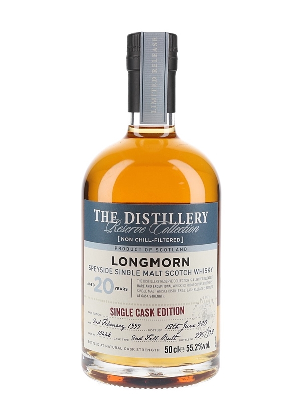 A 50cl bottle of Longmorn 20 Year Old Speyside Single Malt Scotch Whisky from Chivas Brothers' Distillery Reserve Collection. This was distilled on 2 February 1999, matured in a second fill butt and bottled at cask strength on 12 June 2019.