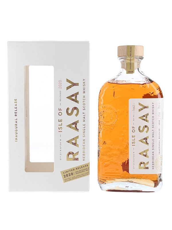 A bottle of Isle Of Raasay Inaugural Release 2020 Hebridean Single Malt Scotch Whisky. This was distilled from 100% Scottish grown Concerto barley and matured in first fill Tennesse whiskey casks before finishing in first fill Bordeaux red wine casks. This first release from Isle of Raasay was bottled at 52% ABV in 2020.