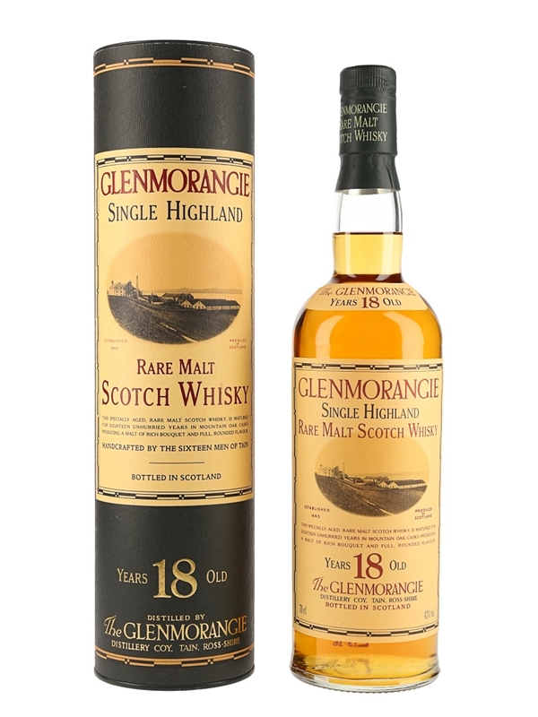 A bottle of Glenmorangie 18 Year Old Single Highland Rare Malt Scotch Whisky. The bottling code indicates this was bottled in 1997.