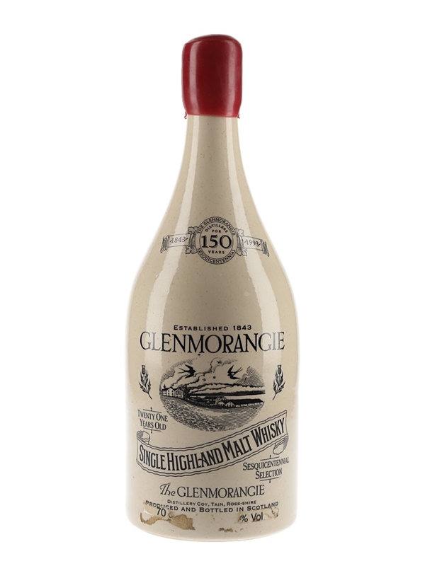 A ceramic bottle of Glemorangie 21 Year Old Sesquicentennial Selection Single Highland Malt Whisky. This was bottled in 1993 to celebrate the 150th anniversary of the founding of the distillery in 1843.