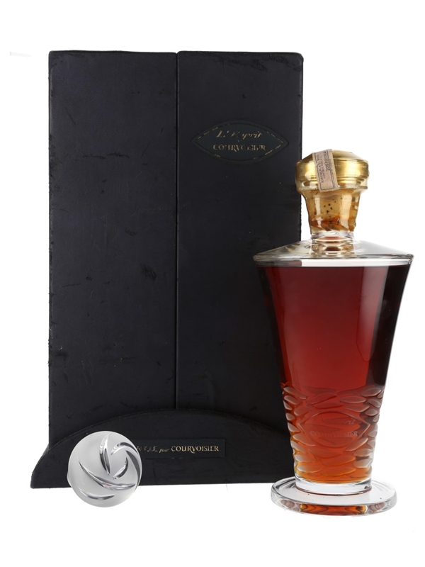 A bottle of L'Esprit de Courvoisier, one of the Cognac house's finest expressions. This is crafted from eaux-de-vie distilled up to 200 years ago, with the youngest spirit in the blend dating from the 1930s. This is presented in a Lalique decanter with stopper.