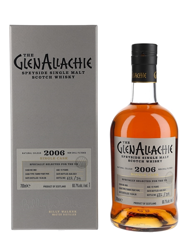 A bottle of Glenallachie 15 Year Old Single Cask Speyside Single Malt Scotch Whisky. This was distilled on 19 April 2006, matured in a Tawny Port pipe and bottled at 60.7% ABV in August 2021 specially for the UK market.