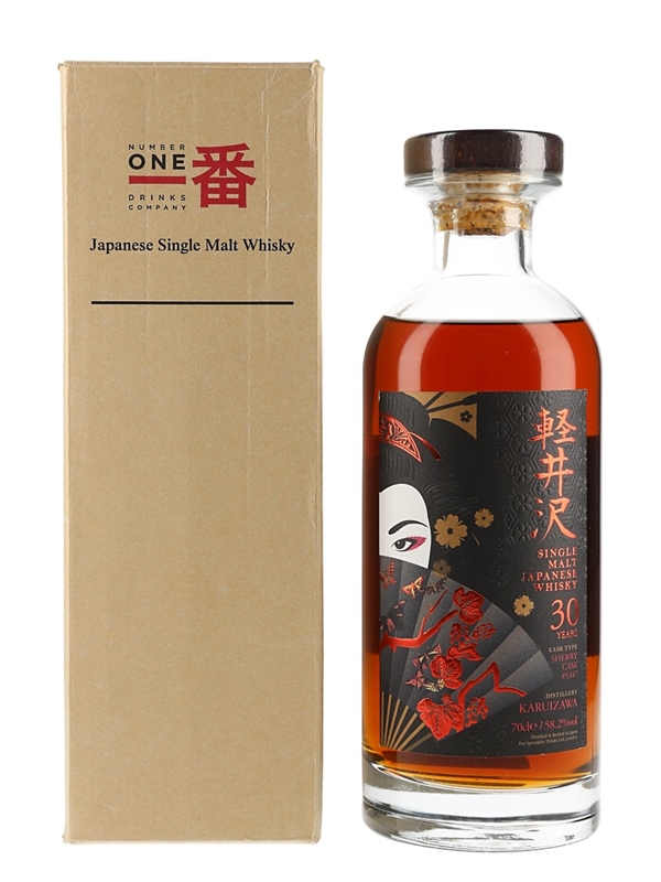 A bottle of Karuizawa 30 Year Old Single Malt Japanese Whisky, one of a pair of Aika Geishas released in 2014. This sherry cask-matured malt was distilled in the 1980s and bottled by Number One Drinks exclusively for Speciality Drinks. Each bottle in the pair has complementary labels designed by The Whisky Exchange's creative director Raj Chavda.