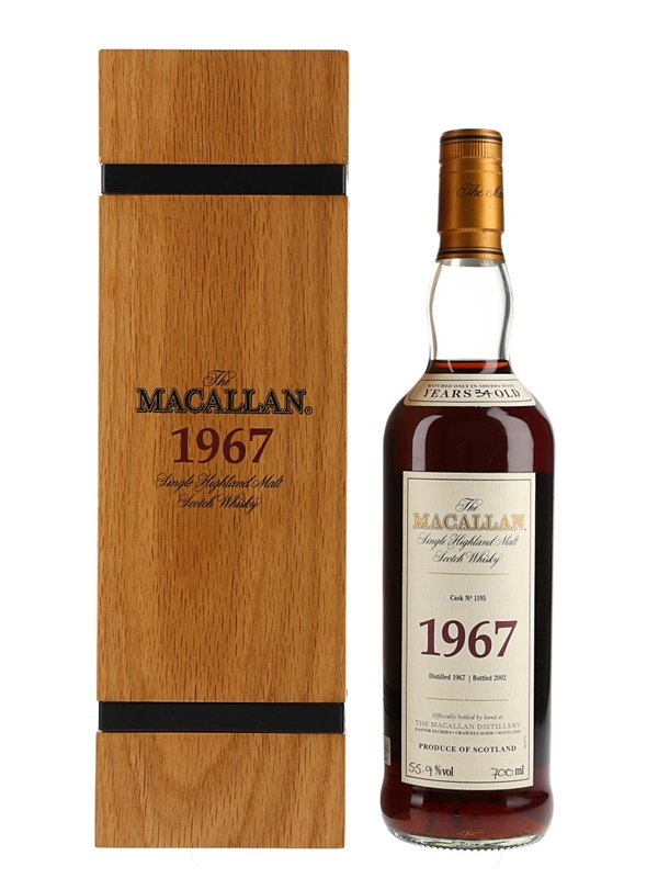 A bottle of The Macallan 1967 Single Highland Malt Scotch Whisky from the Fine & Rare collection. This was matured in sherry cask number 1195 for 35 years and bottled in 2002.