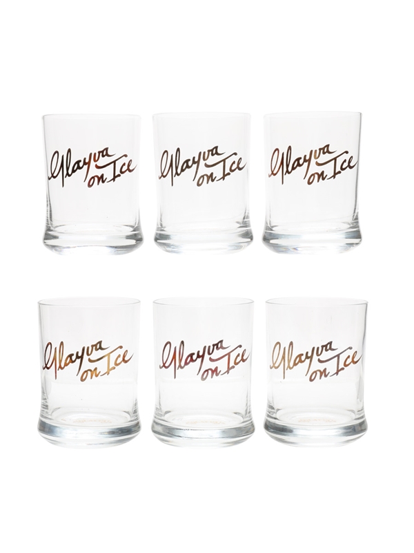 This lot contains six branded Glayva On Ice whisky glasses, the glasses measure 9.5cm by 7cm.