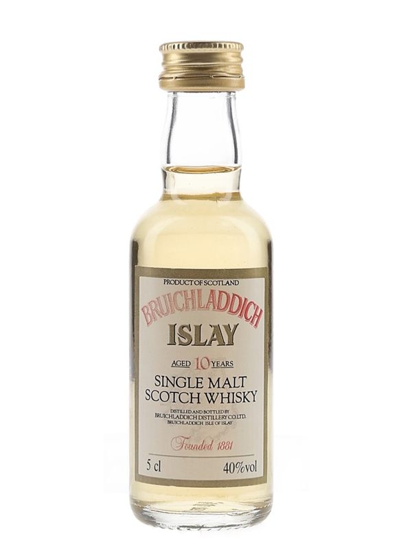 A miniature bottle of Bruichladdich 10 Year Old Islay Single Malt Scotch Whisky. We estimate this was bottled in the 1990s.
