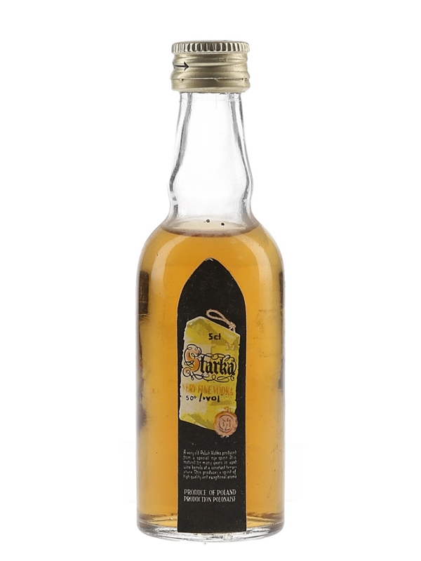 A miniature bottle of Starka Very Fine Vodka, produced and bottled by Polmos in Warsaw, Poland.
