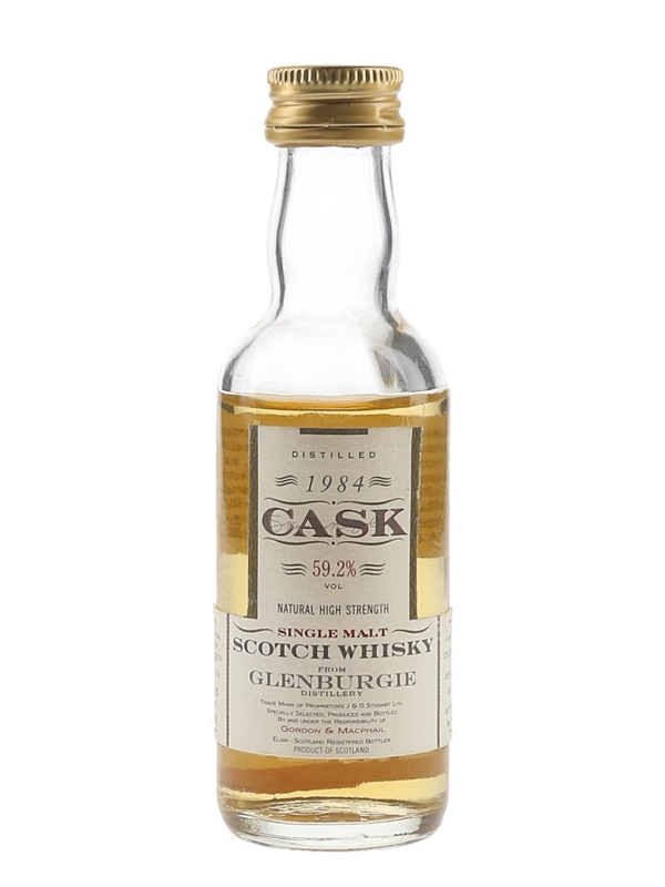 A miniature bottle of Glenburgie single malt Scotch whisky. This was distilled in 1984 and bottled at cask strength by Gordon & MacPhail in May 1994.