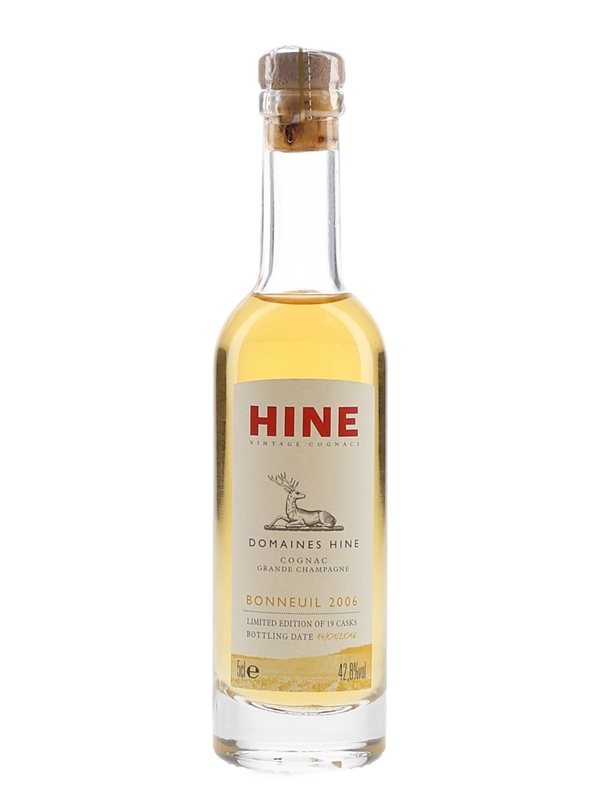 A miniature bottle of Domaines Hine Bonneuil 2006 Grande Champagne Cognac, bottled on 14 January 2016 at 42.8% ABV. This is a limited edition of 19 casks.