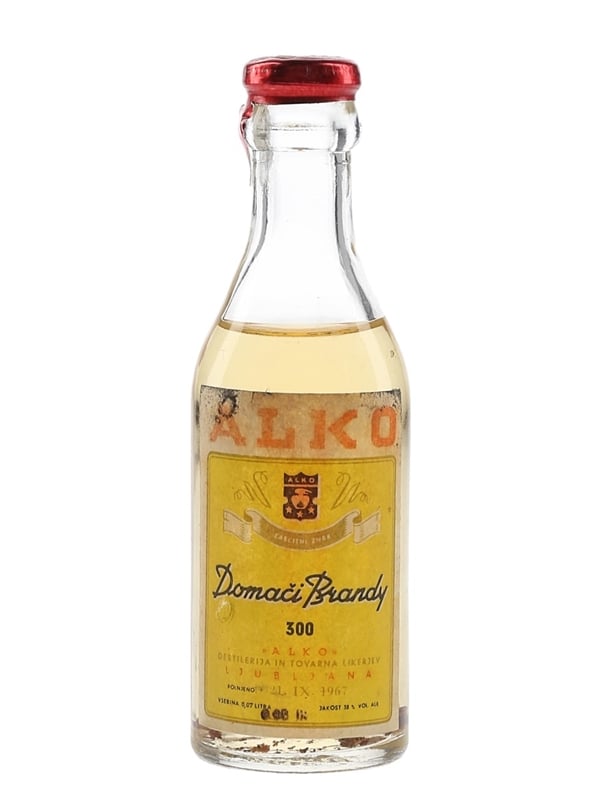 A miniature bottle of Alko Domaci Brandy 300 produced in Ljubljana, Slovenia, and bottled at 38% ABV on 21 September 1967.