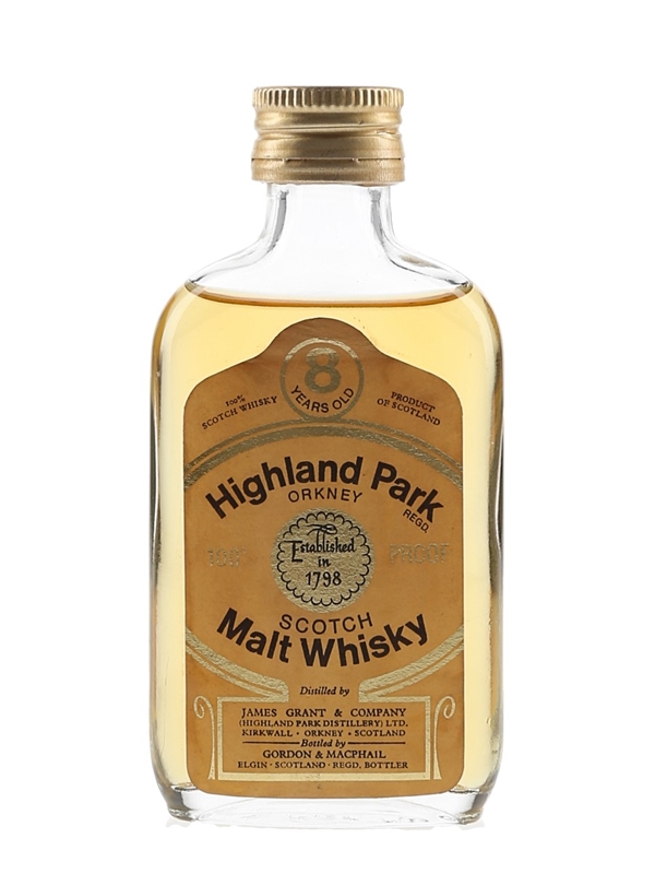 A miniature bottle of Highland Park 8 Year Old 100 Proof Scotch Malt Whisky, distilled by James Grant & Company. This was bottled by Gordon & MacPhail, we estimate in the 1970s.