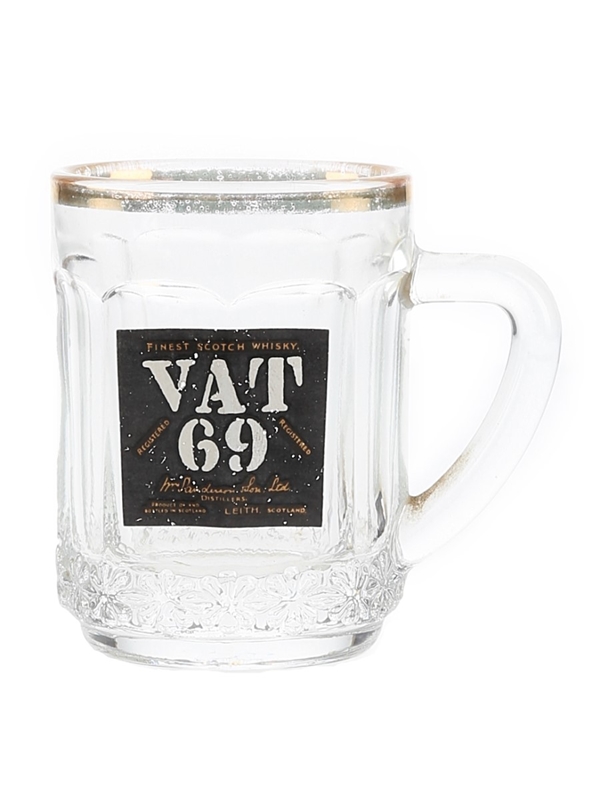 A VAT 69 branded whisky glass with handle. This measures approximately 7cm tall.