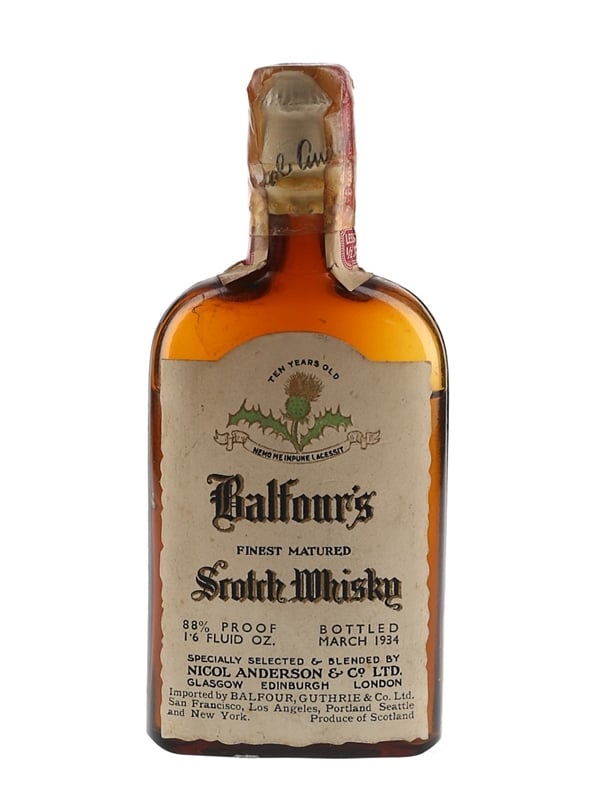 A miniature of Balfour's 10 Year Old Finest Matured Scotch Whisky, selected and blended by Nicol Anderson & Co. for the US market. This was bottled in March 1934 and imported to the US by Balfour, Guthrie & Co.