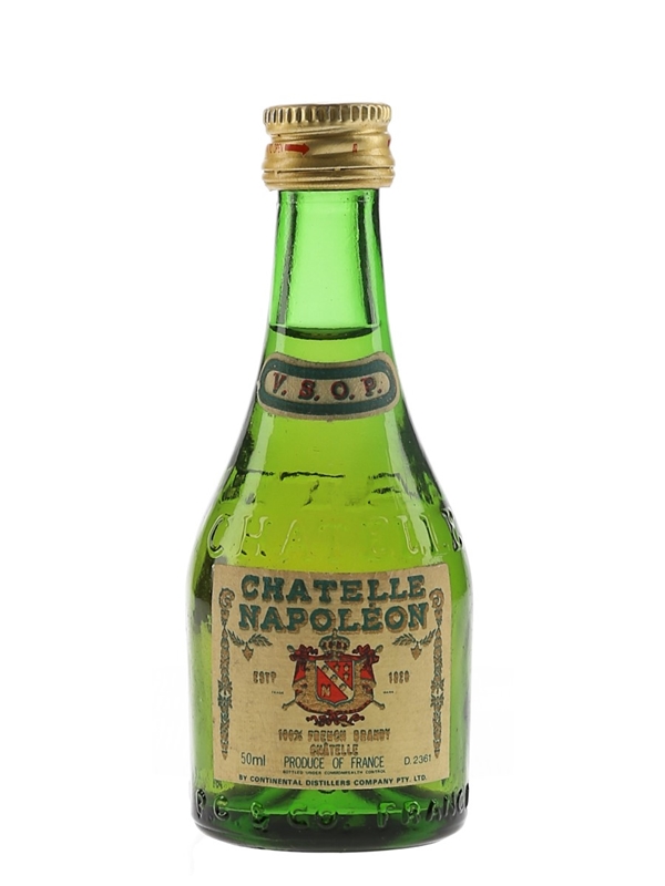 A miniature bottle of Chatelle Napoleon VSOP Brandy produced in France by Continental Distillers Company Pty. Ltd. We estimate this was bottled in the 1980s.