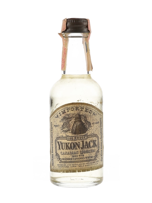 A miniature bottle of Yukon Jack Canadian Liqueur made with Canadian Whisky. This was imported and bottled by Heublein Inc., Hartford, Connecticut, we estimate in the 1980s.