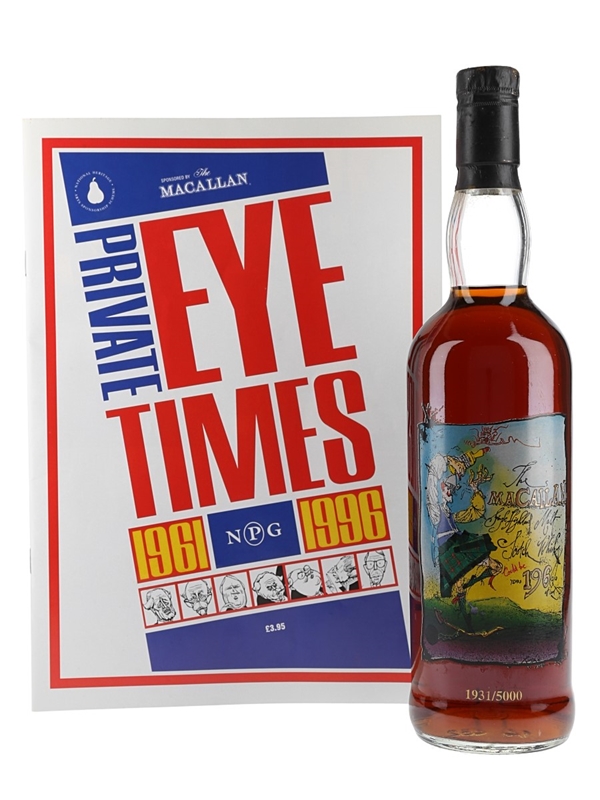 A bottle of The Macallan released in 1996 to celebrate the 35th anniversary of satirical magazine Private Eye. This is a vatting of casks selected by whisky maker FA Newlands and includes a cask from 1961, the year Private Eye was founded.