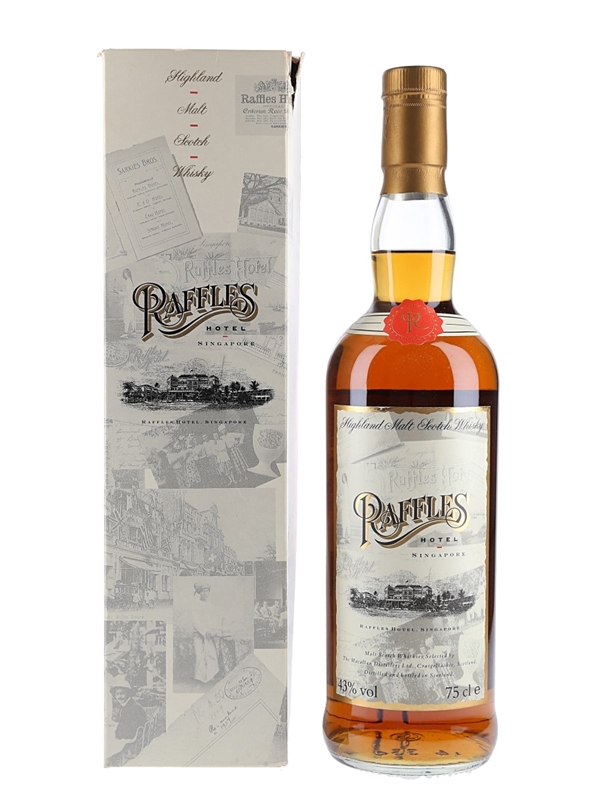 A bottle of Macallan Highland Malt Scotch Whisky, bottled for Raffles Hotel, Singapore.