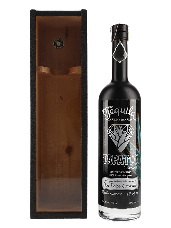 A bottle of Tapatio 10 Year Old Diamante Añejo Limited Edition from Mexico, the last Tequila made under the command of Master Distiller Don Felipe Camarena, for the distillery's 75th anniversary, 1937 to 2012. This is presented in a hand painted bottle with a wooden presentation box, and is bottle number 69 of 75.