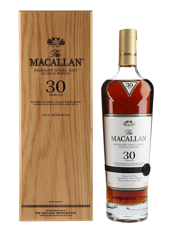 A bottle of The Macallan 30 Year Old Highland Single Malt Scotch Whisky, exclusively matured in sherry seasoned oak casks from Spain. This is the annual 2019 release.