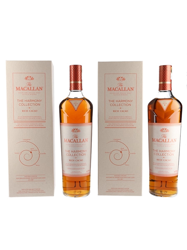 This lot contains two bottles of The Macallan Rich Cacao Highland Single Malt Scotch Whisky from The Harmony Collection, bottled at 44% ABV. This is inspired by the chocolate creations of Spanish chef Jordi Roca, pastry chef at El Celler de Can Roca. The restaurant was twice voted best restaurant in the world.