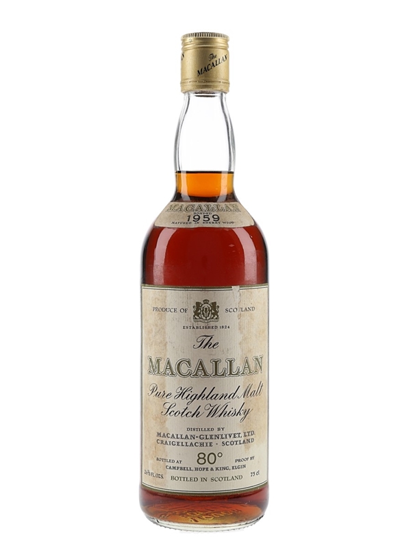 A bottle of The Macallan 1959 Pure Highland Malt Scotch Whisky. Distillery and bottled by Campbell, Hope & King. We estimate this was bottled in the 1970s.