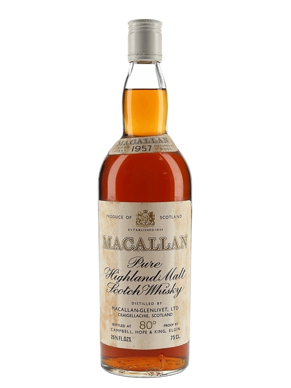 A bottle of The Macallan 1957 Pure Highland Malt Scotch Whisky. Distillery and bottled by Campbell, Hope & King. We estimate this was bottled in the 1970s.