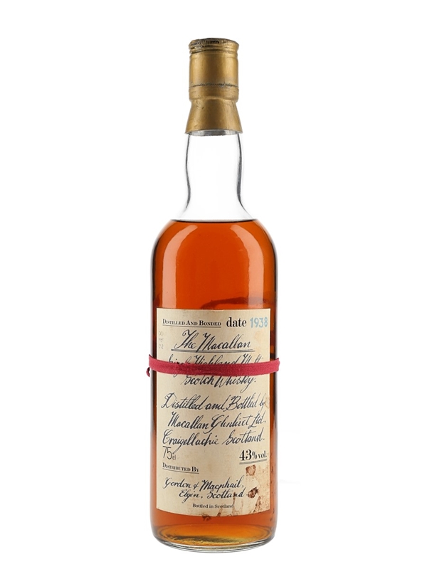 A bottle of The Macallan 1938 Single Highland Malt Scotch Whisky, bottled in the 1980s by Gordon & MacPhail. This bottling has a handwritten label.