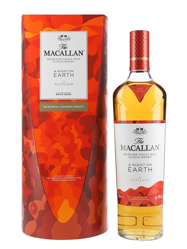 A limited edition bottle of The Macallan A Night On Earth in Scotland Highland Single Malt Scotch Whisky, celebrating the joy of New Year's Eve, known in Scotland as Hogmanay. This was aged in European and American sherry seasoned oak casks and ex-bourbon American oak casks. The packaging was designed by Japanese-French illustrator Erica Dorn.