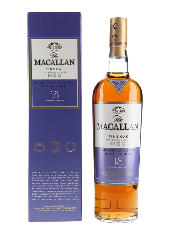 A bottle of The Macallan 18 Year Old Fine Oak Triple Cask Matured Highland Single Malt Scotch Whisky, matured in a combination of bourbon and sherry oak casks and bottled at 43% ABV.
