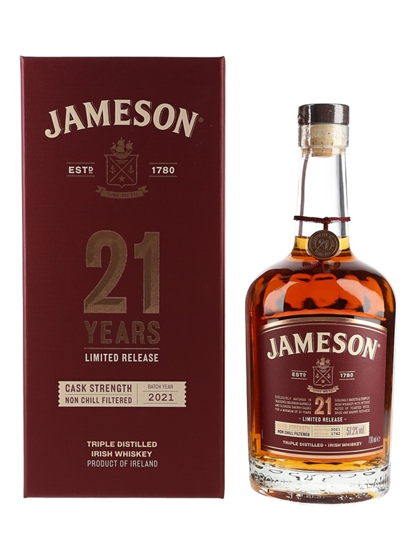 A bottle of Jameson 21 Year Old Cask Strength Triple Distilled Irish Whiskey, matured in seasoned bourbon barrels and oloroso sherry casks. Bottle number 1742 and bottled in 2021.