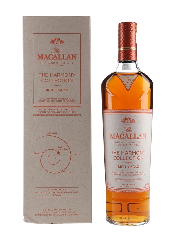 A bottle of The Macallan Rich Cacao Highland Single Malt Scotch Whisky from The Harmony Collection. This is inspired by the chocolate creations of Spanish chef Jordi Roca, pastry chef at El Celler de Can Roca. The restaurant was twice voted best restaurant in the world.