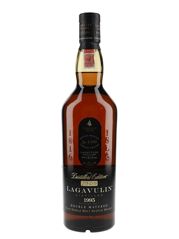A bottle of Lagavulin 1995 Islay Single Malt Scotch Whisky. This was distilled in 1995, finished in ex-Pedro Ximenez sherry casks and bottled 2011 for the Distillers Edition series.