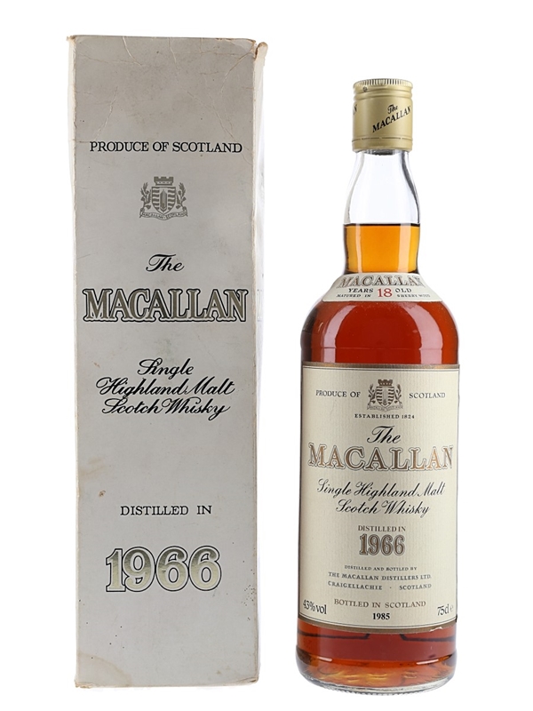 A bottle of The Macallan 18 Year Old, distilled in 1966 and bottled in 1985.