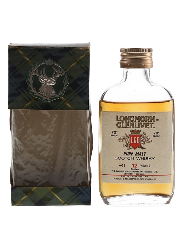 A miniature bottle of Longmorn-Glenlivet 12 Year Old Pure Malt Scotch Whisky from independent bottler Gordon & MacPhail. We estimate this was bottled in the 1970s.