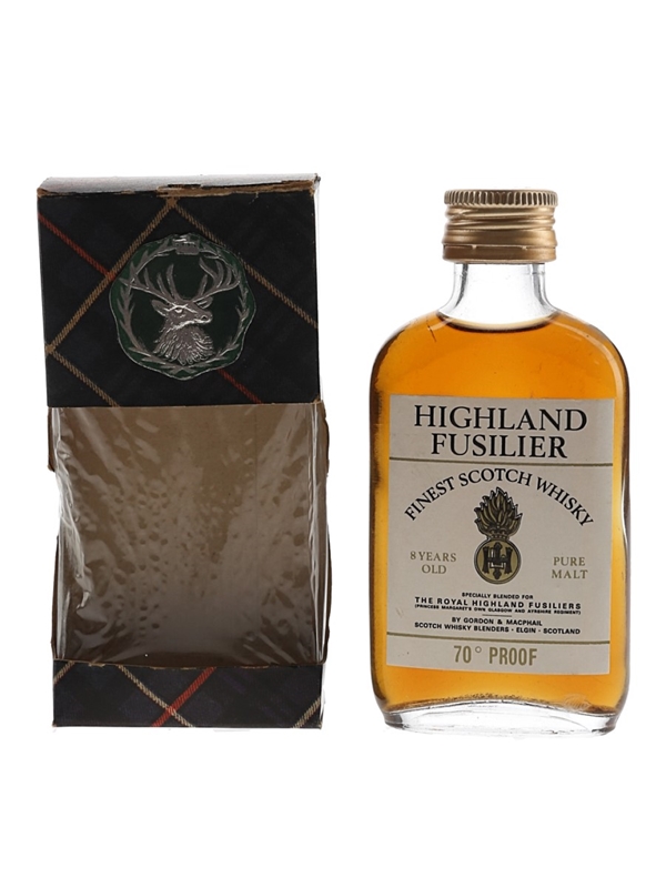 A miniature bottle of Highland Fusilier 8 Year Old Pure Malt Finest Scotch Whisky. This was specially produced for The Royal Highland Fusiliers by Gordon & MacPhail, we estimate in the 1970s.