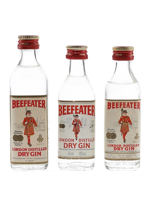 This lot contains three miniature bottles of Beefeater London Distilled Dry Gin produced in London by James Burrough Limited. We estimate these were bottled in the 1960s to 1980s.