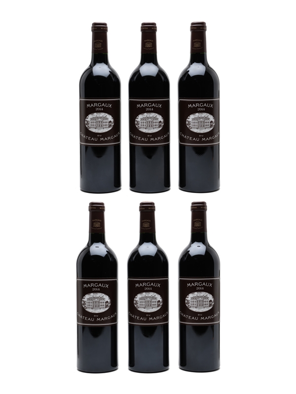 This lot contains six bottles of Margaux de Château Margaux 2014, the third wine from the First Growth Château. in 2014 only 60% of the crop from the estate was used for the 'Grand Vin' and second wine, Pavillon Rouge. This is a blend of 49% each Cabernet Sauvignon and Merlot, and 2% Petit Verdot.