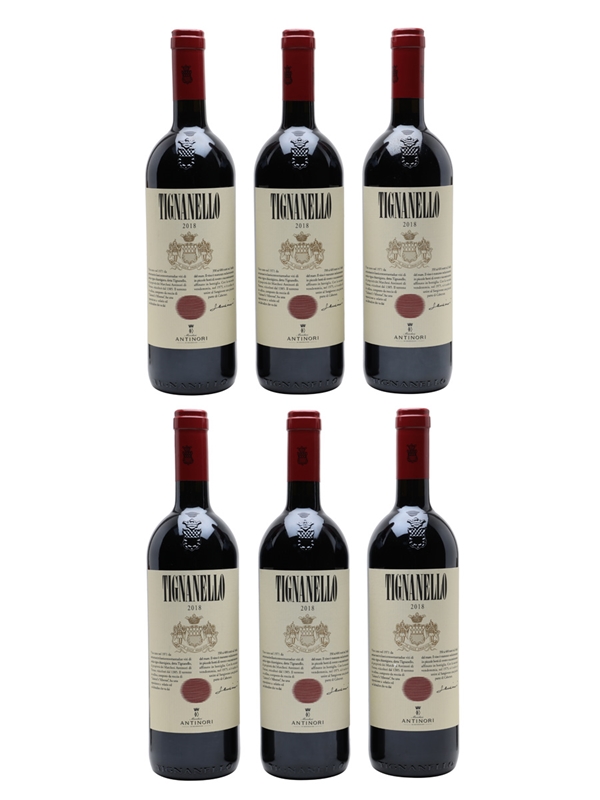 This lot contains six bottles of 2018 Antinori Tignanello, a Tuscan blend of 80% Sangiovese, 15% Cabernet Sauvignon and 5% Cabernet Franc.