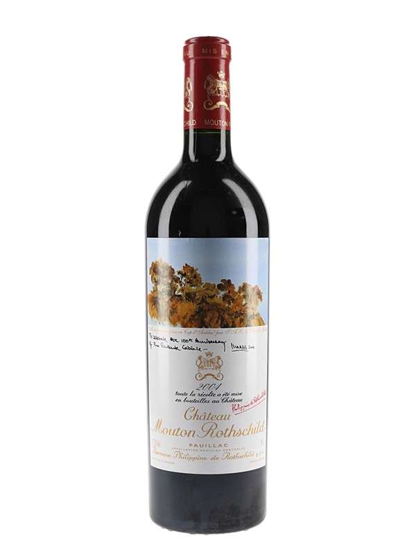 A bottle of 2004 Château Mouton Rothschild from Bordeaux's Pauillac appellation, featuring a label designed by HRH Prince Charles. This is a blend of 69% Cabernet Sauvignon, 15%Merlot, 13% Cabernet Franc and 3% Petit Verdot. The label reads: To celebrate the 100th Anniversary of the Entente Cordiale, Charles 2004.