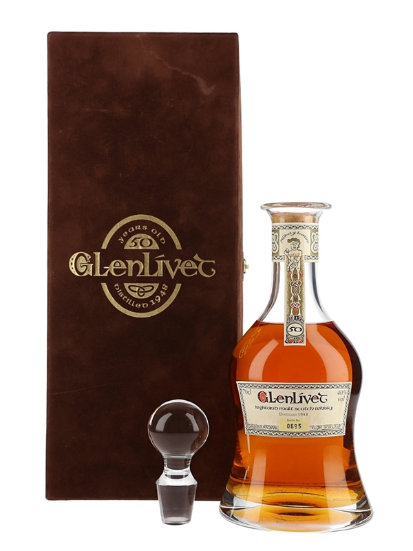 A bottle of Glenlivet 50 Year Old, presented in a decanter with stopper. This was distilled on 11 February 1948 and matured in a selected oak cask, first at the distillery for over 30 years, then for about 20 years in Gordon & MacPhail's Elgin warehouse. This is part of the Book of Kells series.