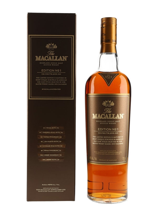 A limited edition bottle of The Macallan Edition No.1 Highland Single Malt Scotch Whisky. This was made from a combination of eight types of American and European oak matured whiskies, bottled at 48% ABV.