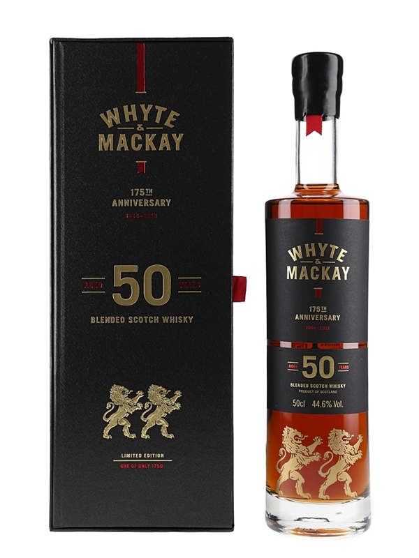 A 50cl bottle of Whyte & Mackay 50 Year Old Blended Scotch Whisky. This was distilled in 1966 and matured in a combination of bourbon barrels, matusalem first and second fill sherry butts, tawny port pipe and Apostoles sherry butts from Gonzalez Byass. This was released in 2019 to commemorate the 175th anniversary of Whyte & Mackay Distillers.