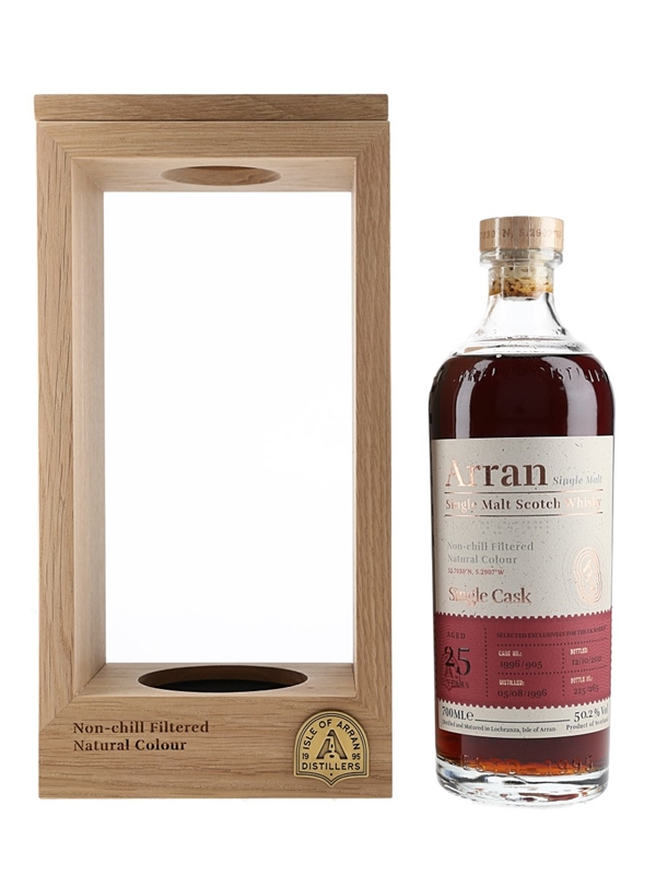 A bottle of Arran 25 Year Old Single Cask Single Malt Scotch Whisky. This was distilled on 5 August 1996, matured in a single sherry cask and bottled at a cask strength of 50.2% ABV on 12 October 2021.