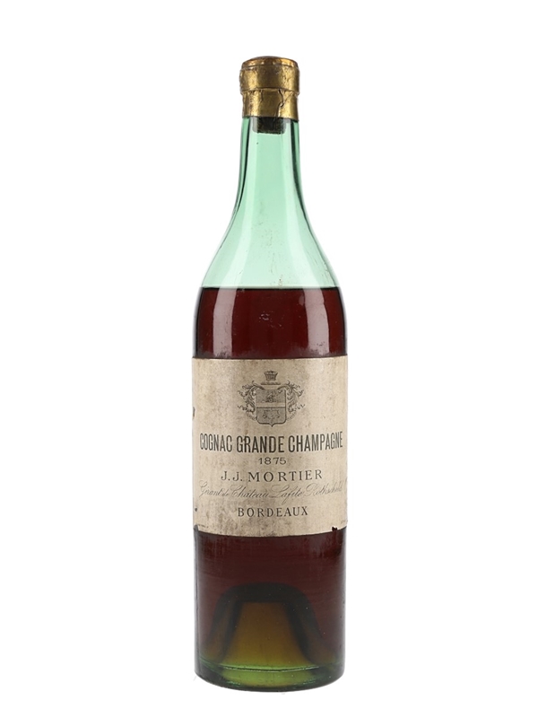 A bottle of 1875 Grande Champagne Cognac bottled by Bordeaux négociants J J Mortier.