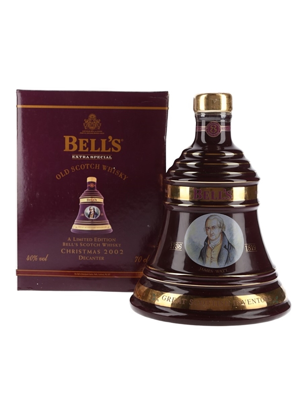 A limited edition bottle of Bell's Extra Special 8 Year Old Scotch Whisky presented in a ceramic Wade dencater and released for Christmas 2002. This decanter is dedicated to the great Scottish inventor James Watt.