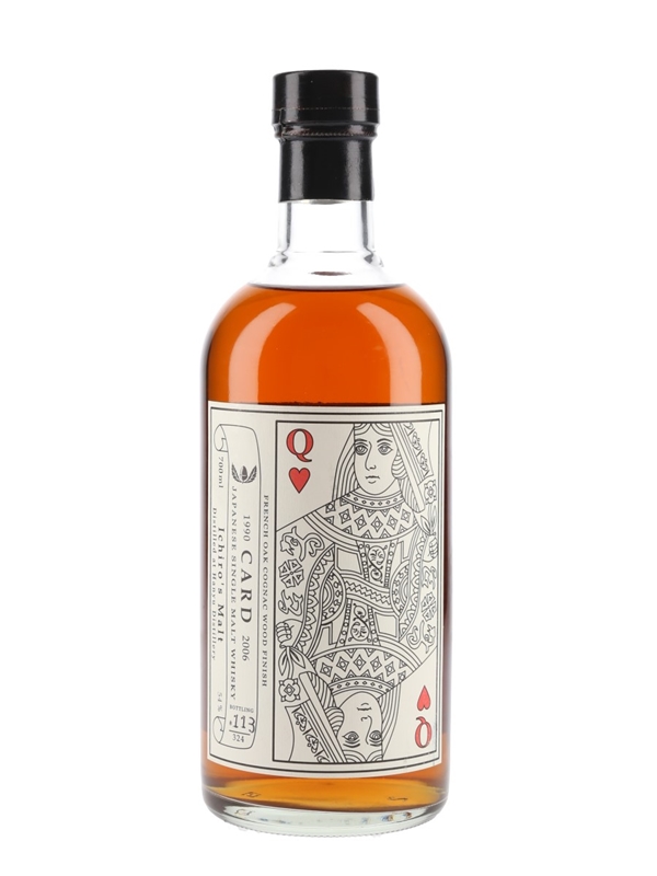 A bottle of Hanyu 1990 Japanese Single Malt Whisky, the Queen of Hearts in the Ichiro's Malt Card series. This was distilled in 1990, matured in a hogshead and finished in a French oak Cognac cask before bottling at cask strength in 2006.