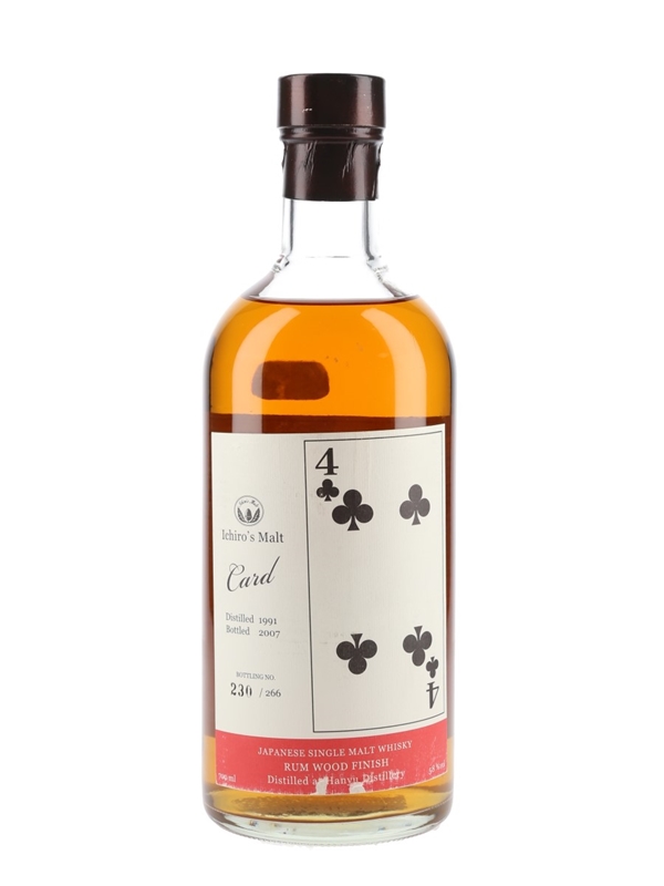 A bottle of Hanyu 1991 Japanese Single Malt Whisky, the Four of Clubs in the Ichiro's Malt Card series. This was distilled in 1991, matured in a hogshead and finished in a rum cask before bottling at cask strength in 2007.