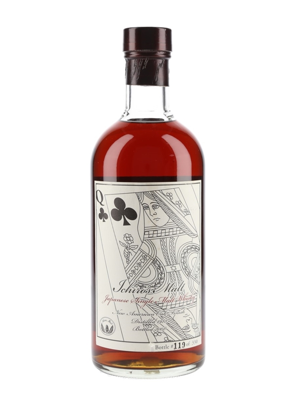 A bottle of Hanyu 1988 Japanese Single Malt Whisky, the Queen of Clubs in the Ichiro's Malt Card series. This was distilled in 1988, matured in a hogshead and finished in a new American oak hogshead before bottling at cask strength in 2008.
