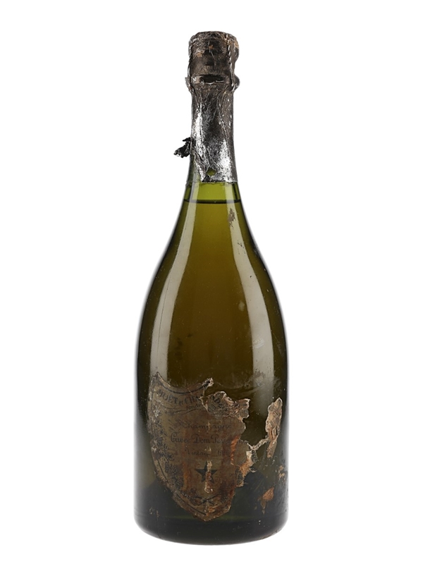 A bottle of 1976 Dom Pérignon vintage Champagne from Möet & Chandon, a blend of 50% Pinot Noir and 50% Chardonnay.